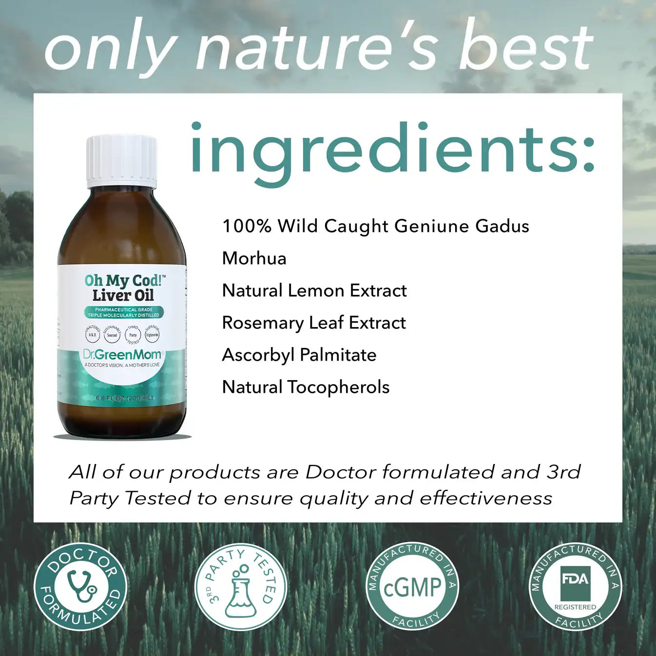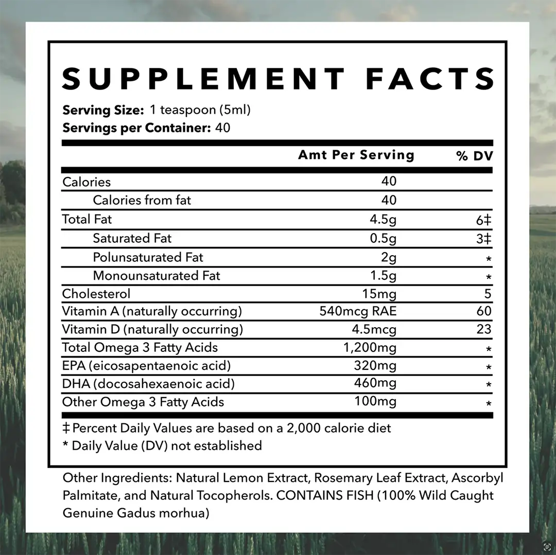 Oh My Cod! Liver Oil, by Dr. Green Mom®, is pharmaceutical grade and triple molecularly distilled. It delivers 460 mg DHA, 320 mg EPA, plus naturally occurring Vitamins A & D to meet the health needs across the whole life span.