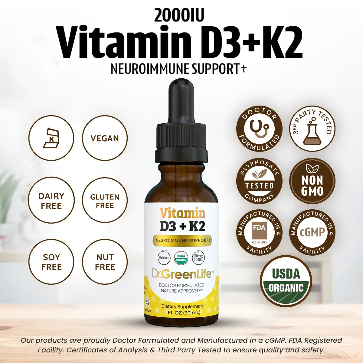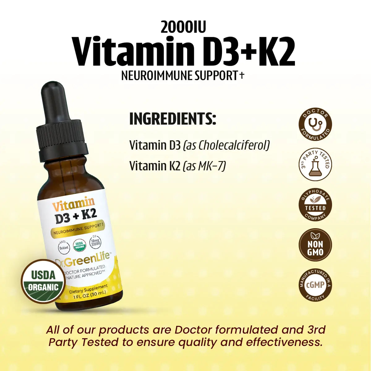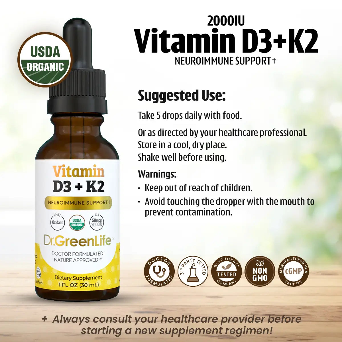 USDA Organic NEUROIMMUNE™ VITAMIN D3 (2000IU) + K2 is vitamin formula to  enhance Immune function, Neurological support PLUS cognition.