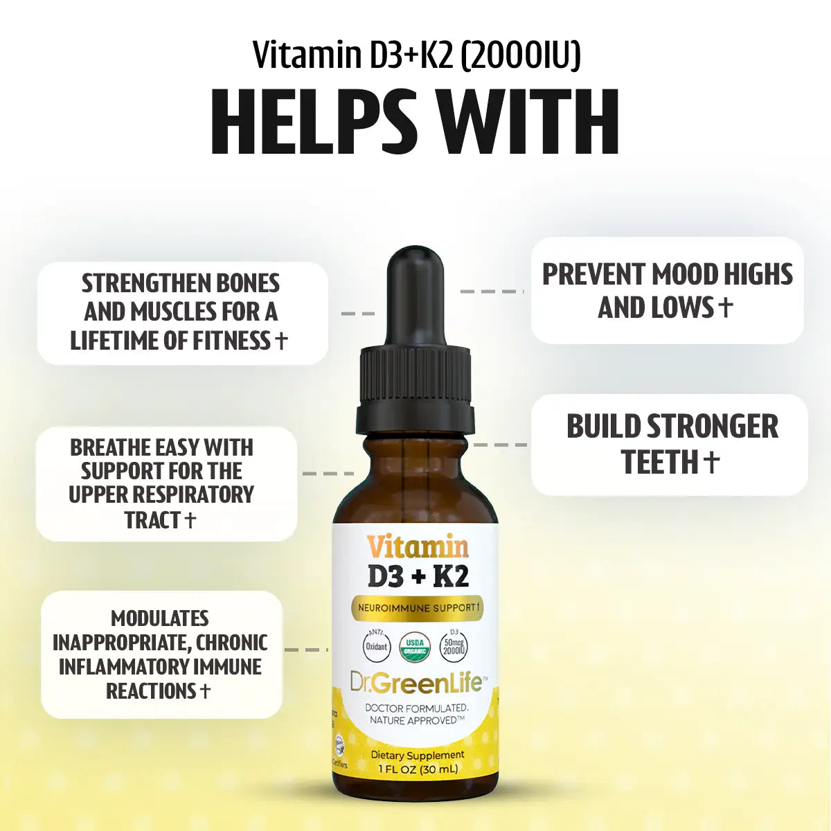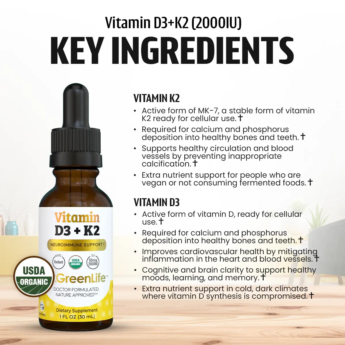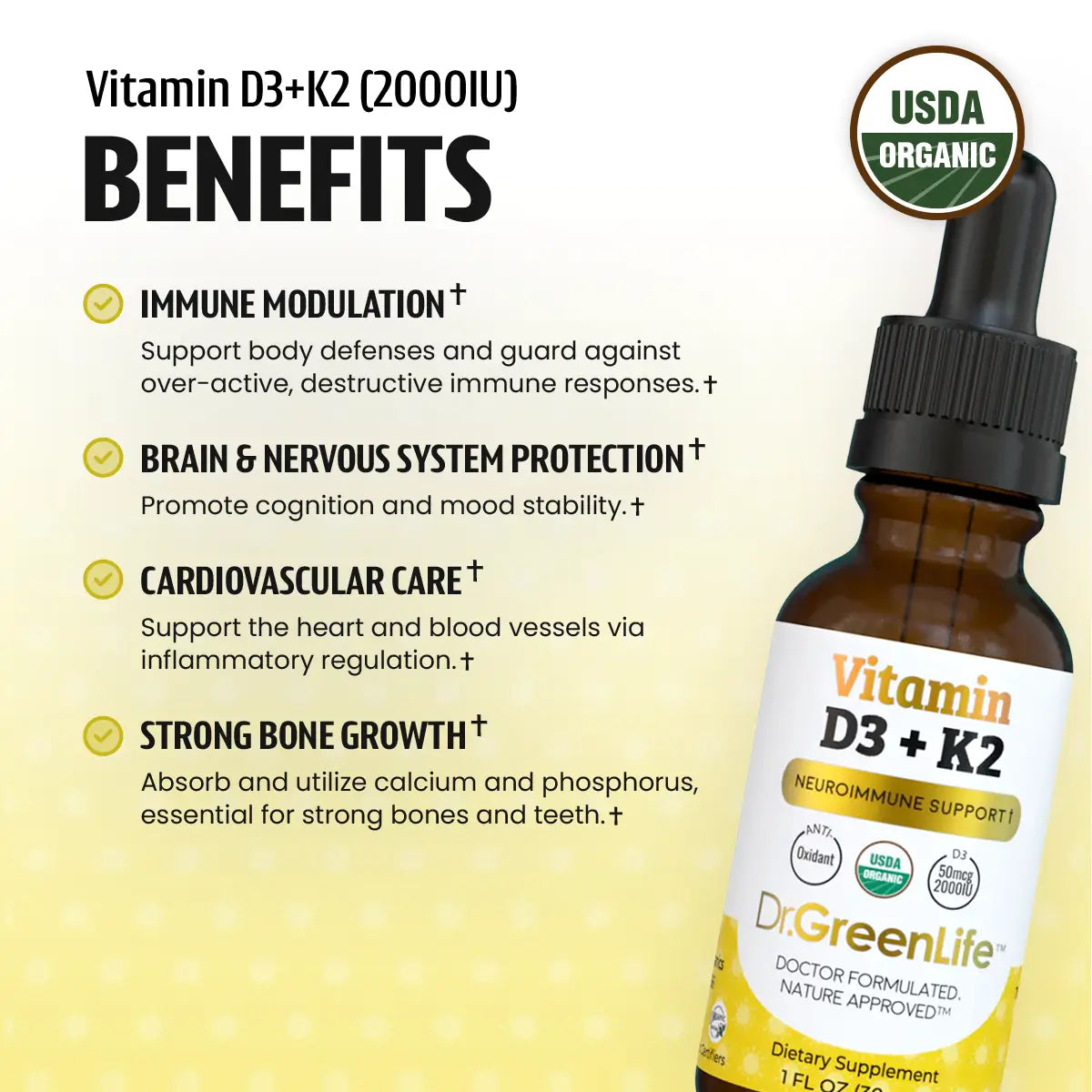 USDA Organic NEUROIMMUNE™ VITAMIN D3 (2000IU) + K2 is vitamin formula to  enhance Immune function, Neurological support PLUS cognition.